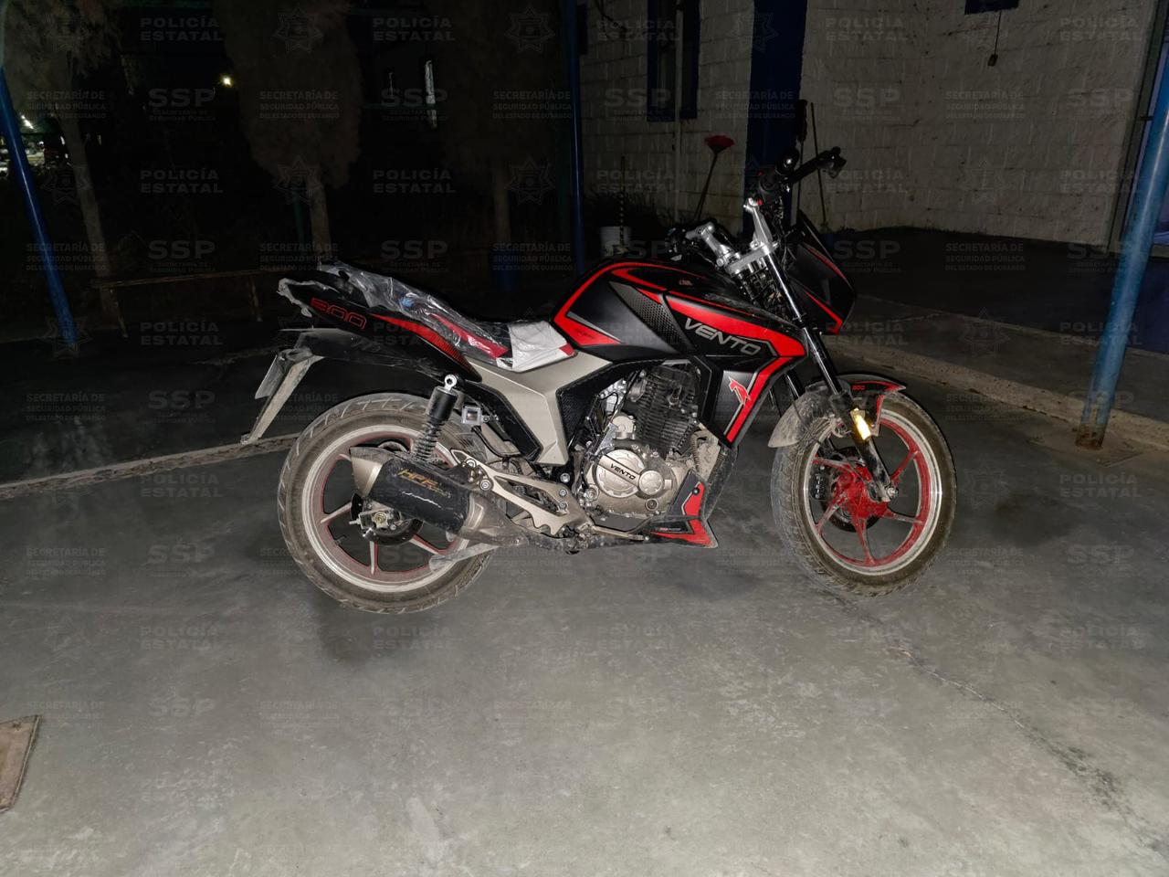 La detención del motociclista ocurrió en un filtro de seguridad ubicado sobre la carretera La Unión, a la altura del kilómetro 1.5, cerca de la colonia Nueva Laguna. El conductor detenido fue identificado como Julio ‘N’, de 24 años de edad, con domicilio en el fraccionamiento Torremolinos de Gómez Palacio, y la motocicleta era marca Vento Tornado, modelo 2026, en color rojo con negro, con placas del estado de Durango que pertenecían a otra unidad.