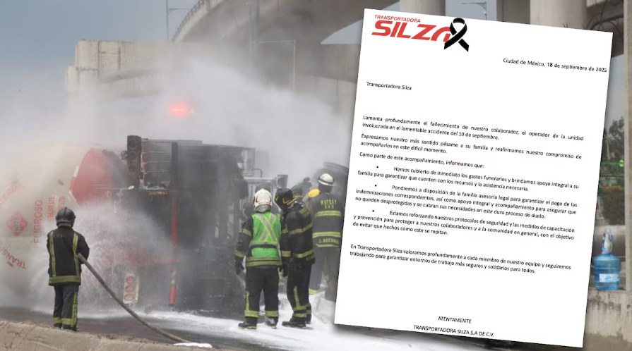 Ciudad de México, viernes 19 de septiembre de 2025. La transportadora Silza —propietaria de la pipa que explotó en el Puente La Concordia— informó que cubrió los gastos del funeral del chofer Fernando Soto Munguía y que brindará asesoría legal a su familia. La empresa expresó condolencias y aseguró que acompañará a los deudos tras el deceso del operador, ocurrido el 16 de septiembre por las heridas del siniestro del 10 de septiembre.