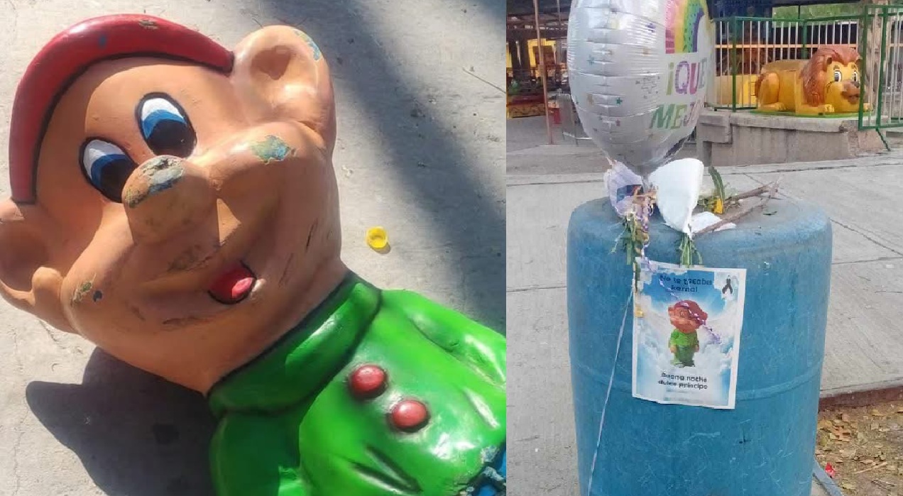 El joven involucrado, identificado como Axel y de 18 años de edad, perdió dos dedos de uno de sus pies al intentar trepar en la estatua de ‘Tontín’, ubicada cerca del área de los juegos mecánicos del parque. De acuerdo con los hechos reportados, la caída provocó que el joven sufriera una herida de gravedad y que la escultura acabara hecha pedazos.